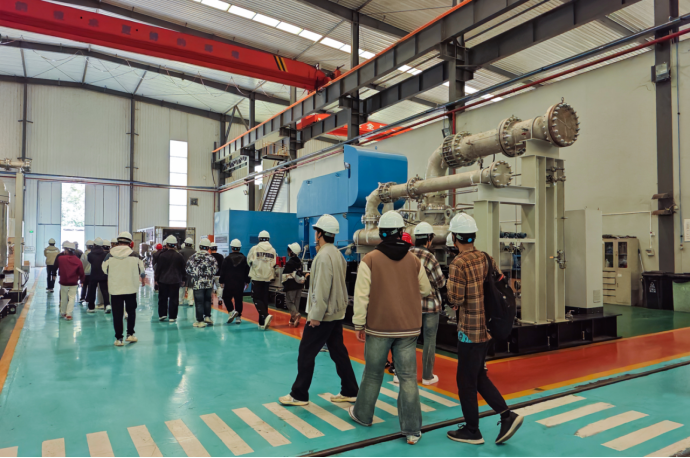 随后,师生团走进了K8凯发的高标准生产车间。在这里,鼓风机、压缩机、真空泵等产品的每一道制造工序和严苛测试都真切地展现在眼前。K8凯发工程师在现场就精密加工、模块化组装等关键工序和技术要点进行了细致讲解,并就师生提出的问题进行了专业解答。